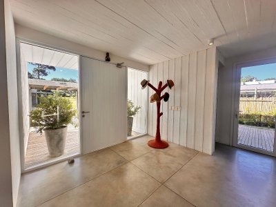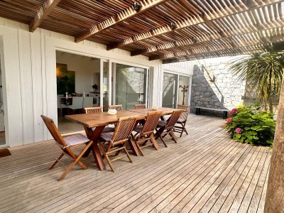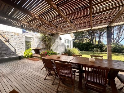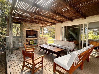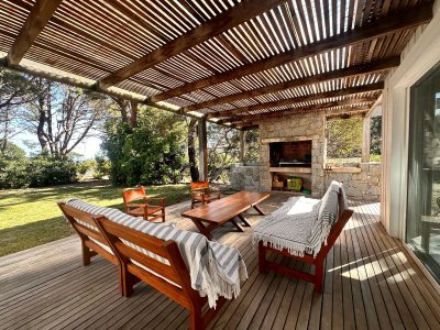 Exterior integrado a la casa con, excelente parrillero cubierto rodeado por deck, hogar a leña y living de exterior para disfrutar de las tardes de verano.