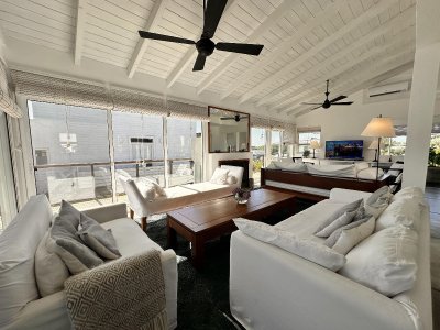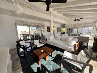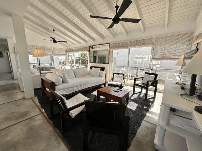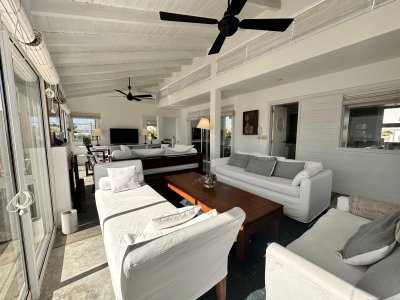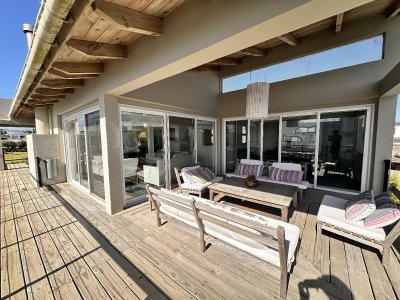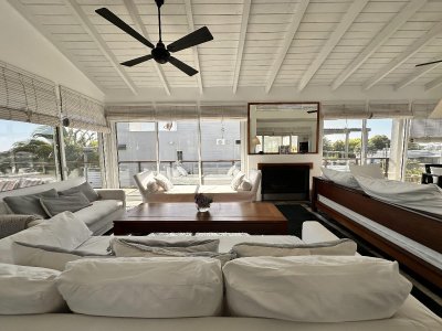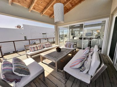 Galería exterior con livings y espacios para disfrutar de las vistas al mar y al faro. La casa se vende totalmente equipada