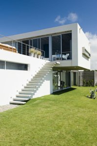 Diseño del Ar. Martín Gomez, la casa se desarrolla en una L de dos plantas con hermosa vista al mar. Construcción tradicional.