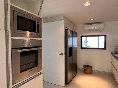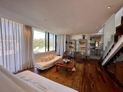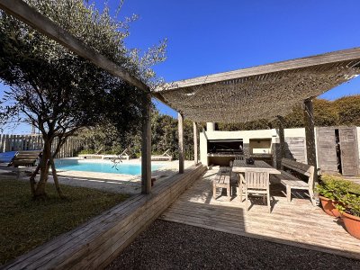 Sector con gran barbacoa de ventanales corredizos que permiten la conexión con el hermoso jardín interno y piscina. Living de exterior y reposeras.