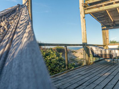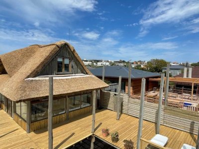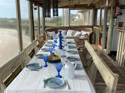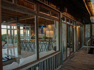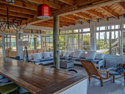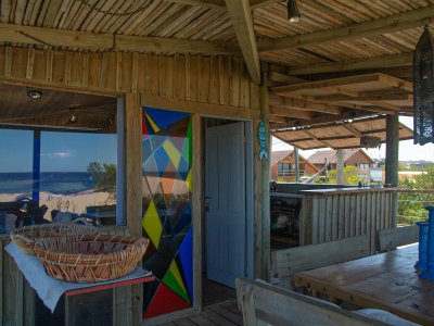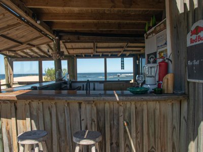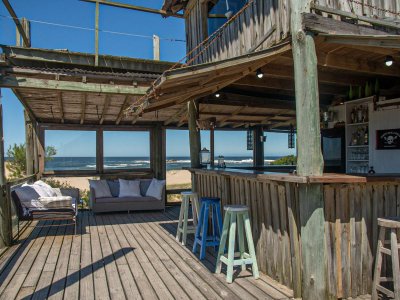 Sector de terraza con bar hacia la playa y comedor exterior.