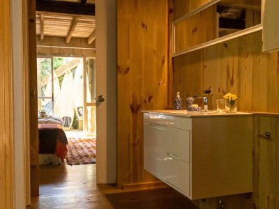 Dos módulos conectados por deck y galería, en distintos niveles.