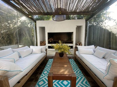 Salida a galería cubierta con Living comedor exterior y sala de estar con hogar a leña para disfrutar al aire libre.
