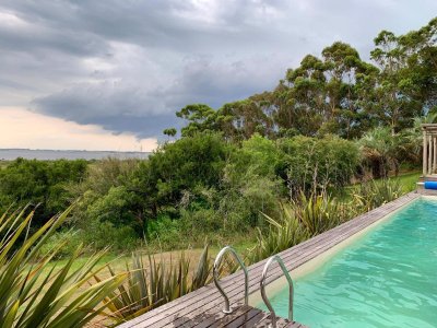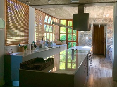En planta baja se encuentra una cálida sala con hogar a leña y vista, sala de bar, living comedor y cocina privada muy bien equipada. Toilette. Lavadero y despensa.