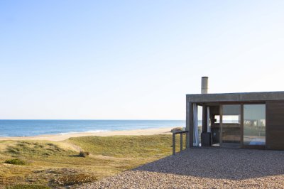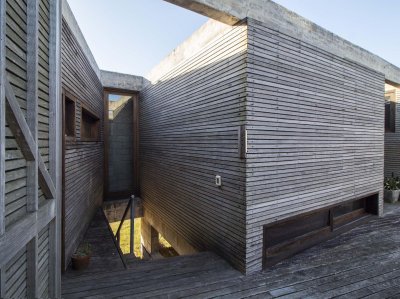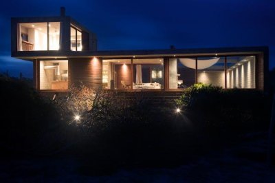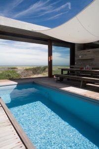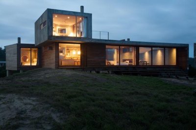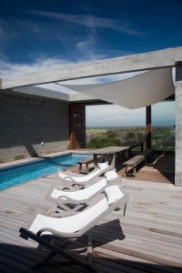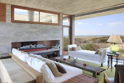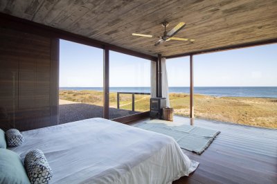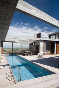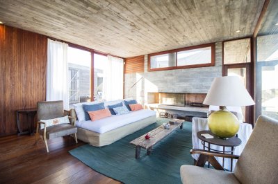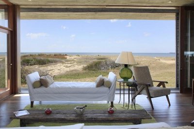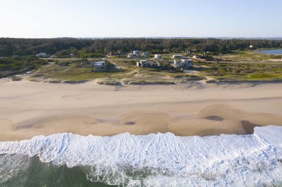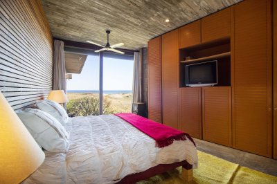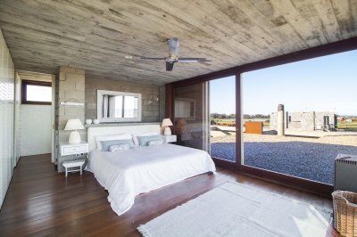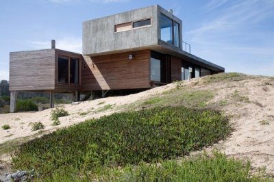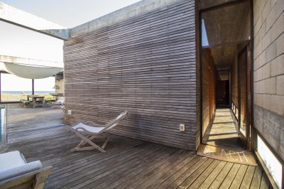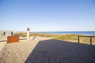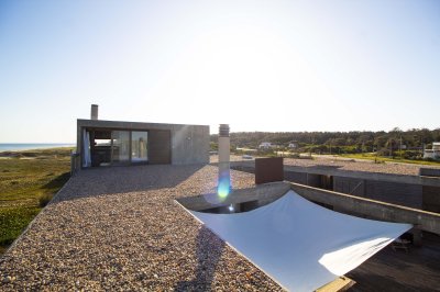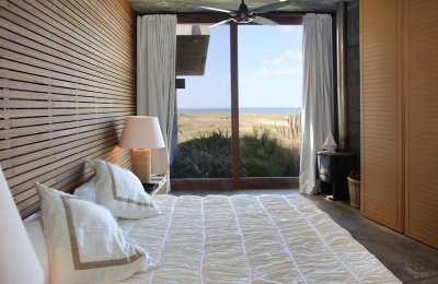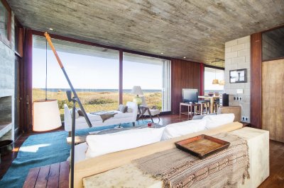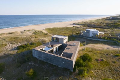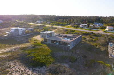 Moderna propiedad ubicada frente al mar en Santa Mónica. Destacado diseño del Arq. chileno Mathias Klotz, la casa se desarrolla en altura y sobre medanos con vistas panorámicas, construida en materiales nobles y sólidos en armonía con el entorno. Jardín interno muy privado con pileta y barbacoa. Cuenta con dos módulos separados por deck de lapacho.