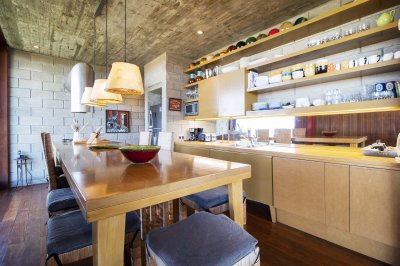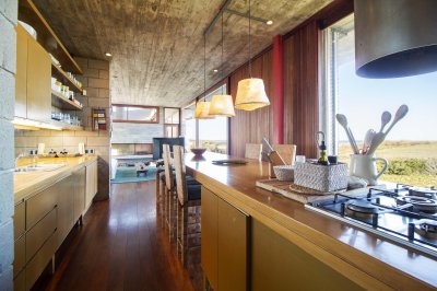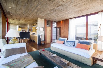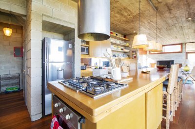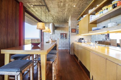 En un módulo se encuentran la cocina y un amplio living con hogar a leña, toilette, master suite en planta alta con hermosa vista al mar.