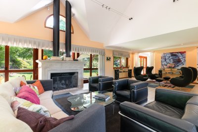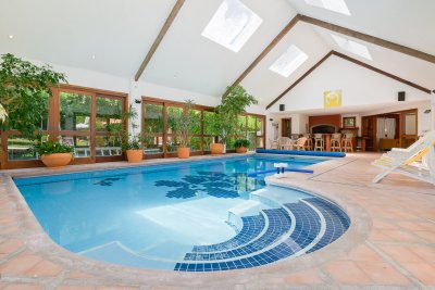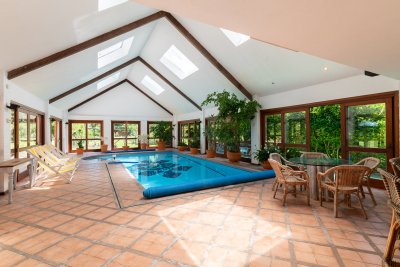 Spread across two levels, the ground floor offers a spaciousbright livingdining area with a wood-burning fireplacelarge windows framing views of the garden. It also includes a separate dining room, a guest bathroom, a cozy sitting room, a fully equipped kitchen with an island,internal staircase access to the garage. Highlighting the floor is an integrated barbecue area with a heated, covered swimming pool, perfect for year-round enjoyment. Additionally, this level includes two large bedroomsa full bathroom.
