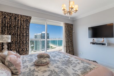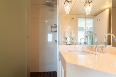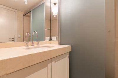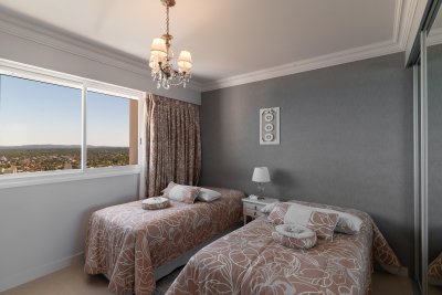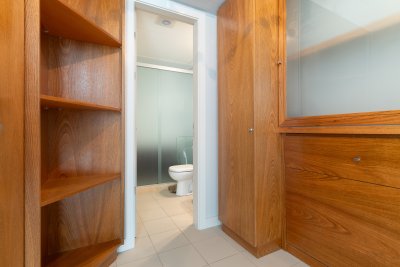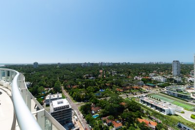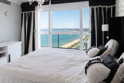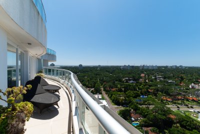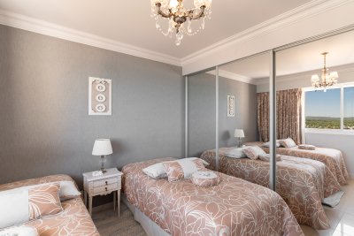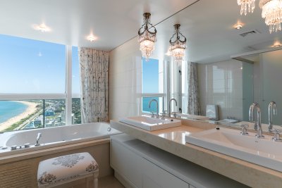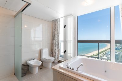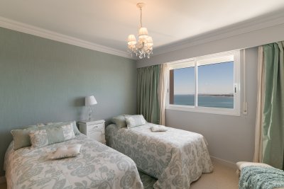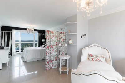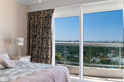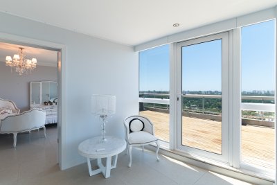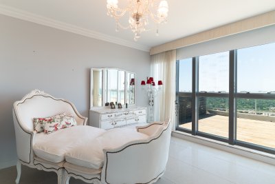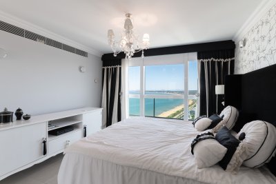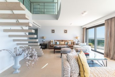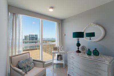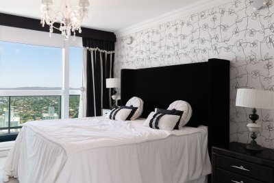 De un lado del piso, dos acogedoras salas de estar, una de ellas con aislamiento acústico, ideal como music room o espacio de entretenimiento. Del otro lado, una imponente master suite, con ventanales laterales que ofrecen vistas a Isla Gorriti y Punta Ballena. Su baño privado incluye hidromasaje para dos personas, doble bacha y ducha independiente.