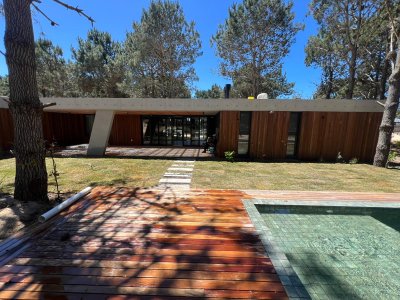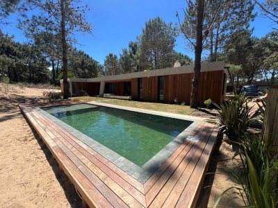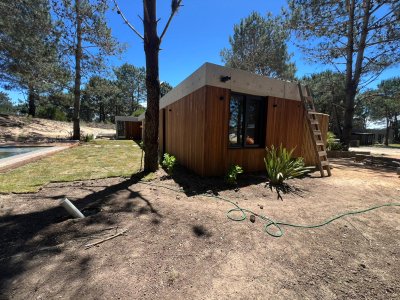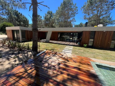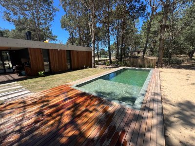 La tecnología que se emplea en su construcción será tradicional. Estructura de hormigón armado, losas vistas, muros de ticholo de 18cm revocado y con terminación de pintura interior sobre fino en interior y revestimiento de lapacho mixto hacia el exterior. Tiene una apertura importante desde el comedor hacia la galería, donde hay un entablonado semi cubierto por varillas de pino tratada. También tendrá un parrillero revestido en ladrillos refractarios y una cómoda barra de servicio. Esta misma galería tiene una conexión inmediata con la piscina, que se encuentra rodeada por un deck de pino curado, con solárium. La casa contempla el diseño y ejecución de una zona de fuegos al aire libre, concebida como un espacio de encuentro y esparcimiento. Se proyecta bajo una pérgola estructural de madera tratada, con cubierta opcional de cañas o policarbonato traslúcido, que ofrece protección parcial contra la intemperie y tamiza la luz natural, generando un ambiente cálido y acogedor.