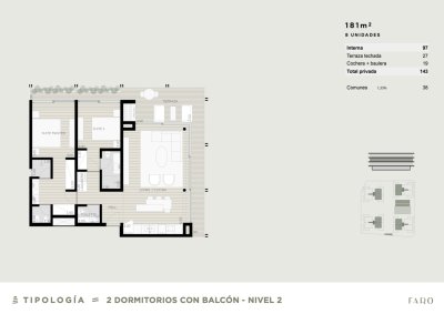 2 dormitorios. Con superficie cubierta de 97 m2, 27 m2 de terraza.