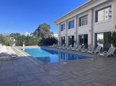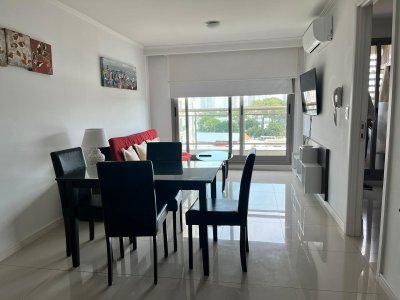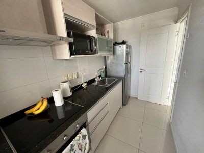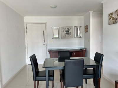 El apartamento es un refugio de confort y estilo, con un luminoso y espacioso living comedor que cuenta con Smart TV, sofá cama y mesa para cuatro personas. La cocina independiente está totalmente equipada con heladera con freezer, microondas, horno empotrado y anafe vitrocerámico, y se conecta a una práctica terraza de servicio que incluye un área de lavadero.